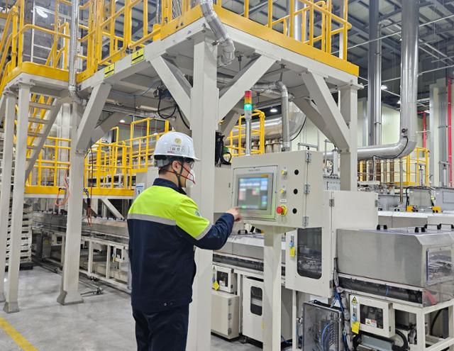 세종시에 있는 포스코퓨처엠 기술연구소 파일럿 플랜트에서 한 연구원이 리튬망간리치(LMR) 양극재 제품 생산을 테스트하고 있다. 포스코퓨처엠 제공 |