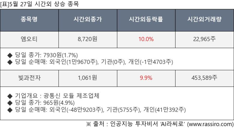 [서울=뉴스핌] 로보뉴스 = 5월 27일, 인공지능 투자비서 ‘AI라씨로’가 엠오티(413390), 빛과전자(069540) 등 시간외 단일가 매매 상승률 상위 종목들에 대한 최근 동향을 분석했다.