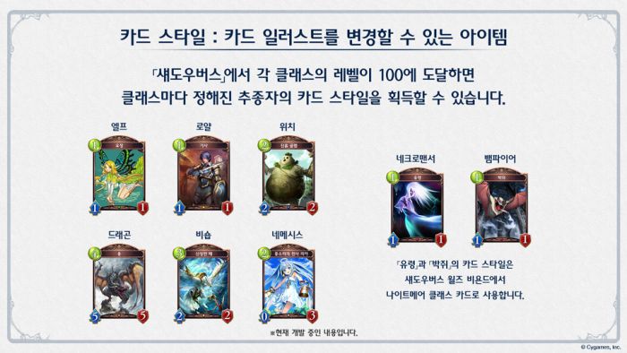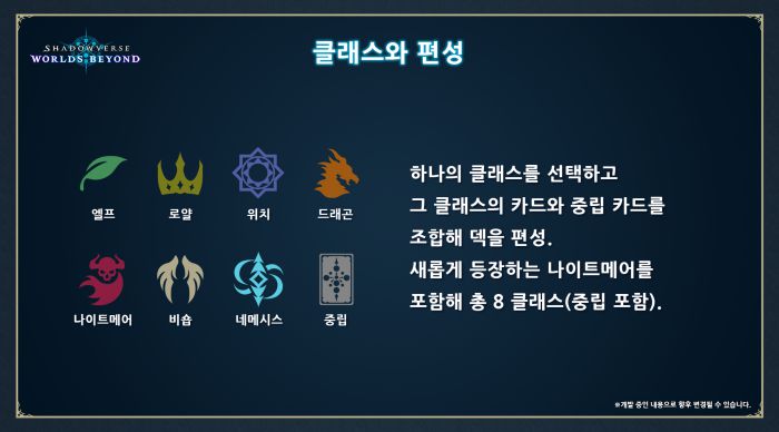 클래스는 전작과 유사한 특징을 지닌 클래스로 엘프, 로얄, 위치, 드래곤, 비숍, 네메시스가 준비돼 있으며, 뱀파이어와 위치가 사라지고 두 클래스의 특징을 통합한 ‘나이트메어’가 새로운 클래스로 추가됐다. 나이트메어는 저코스트의 추종자를 꾸준히 소비하며 묘지를 쌓은 후, 사령술로 묘지를 소비해서 강력한 효과를 발생시키는 클래스다. 물론 중립 클래스 카드도 준비돼 있다.