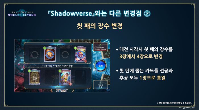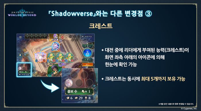 대전 시작 시 선택하는 패의 수도 3장에서 4장으로 늘어났다. 또한, 첫 턴에 주어지는 손패의 수는 기존 선공 1장 / 후공 2장에서 선·후공 관계없이 동일하게 1장만 주어진다. ‘크레스트’는 대전 중에 리더에게 부여되는 능력으로, 대전 중 최대 5개까지 보유할 수 있다.