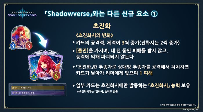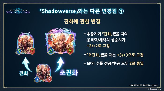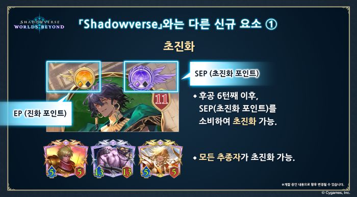 특히 이번 작품의 최대 특징인 ‘초진화’는 EP를 소비하는 기존의 진화와는 별개로 ‘SEP’라는 새로운 포인트를 소비해 추종자에게 더욱 강력한 효과를 부여하는 시스템이다. 초진화는 후공 6턴째 이후부터 사용할 수 있으며, 진화와 마찬가지로 한 대전에서 최대 2회까지만 발동할 수 있다. 한 턴에 진화와 초진화를 모두 발동하는 건 불가능하기에 상황에 따른 전략적인 판단이 요구된다.