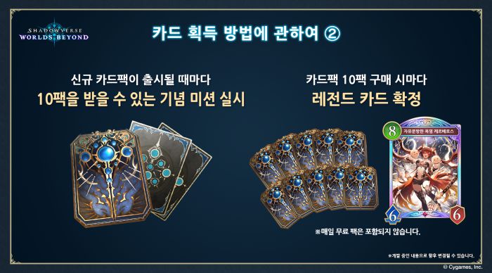 카드 게임의 최대 진입 장벽인 카드 획득 문제를 해결하기 위해 획득처를 다방면으로 확장했다. 우선 매일 1팩씩 무료로 카드팩을 개봉할 수 있다. 신규 카드팩이 출시되면 10팩을 무료로 받을 수 있는 기념 미션을 실시한다. 추가로 카드팩 10팩을 구매할 때마다 최소 1장은 레전드 카드가 보장된다.