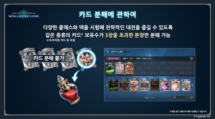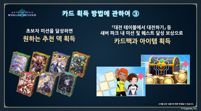 추가로 초보자 미션을 달성하면 원하는 추천 덱 한 세트를 무료로 받을 수 있으며, <월즈 비욘드>에서 새로 도입된 커뮤니티 기능 ‘섀버 파크’의 미션과 퀘스트를 달성해서 각종 아이템과 카드팩을 추가로 획득할 수 있다.