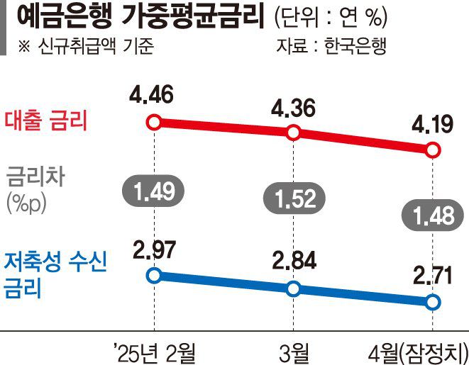 한국은행이 27일 발표한 '2025년 4월 금융기관 가중평균 금리' 통계에 따르면 신규취급 기준 예대금리차는 1.48%p를 기록했다. 전월(1.52%p)보다 0.04%p 축소되며 8개월 만에 감소했다. 잔액 기준 예대금리차도 2.25%p에서 2.21%p로 0.04%p 낮아졌다.