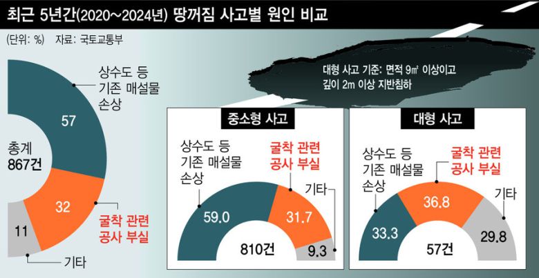 국토부는 먼저 굴착공사 부실에 따른 지반침하 예방과 함께 착공 전후 안전관리를 강화한다는 계획을 밝혔다. 지난 5년간 땅꺼짐 사고 유형을 살펴본 결과, 굴착 관련 공사 부실이 주된 요인 가운데 하나로 지목됐기 때문이다. 이날 국토부 집계를 보면, 최근 5년간(2020~2024년) 발생한 땅꺼짐 사고의 가장 큰 원인은 ‘상수도 등 기존 매설물 손상’(57%)이었지만, ‘굴착공사 부실’(32%)도 뒤이어 큰 비중을 차지했다. 특히 인명피해 우려가 큰 깊이 2m 이상의 대형 땅꺼짐 사고만 놓고 보면, 굴착공사 부실 비중(37%)이 매설물 손상(33%)보다 더 컸다.