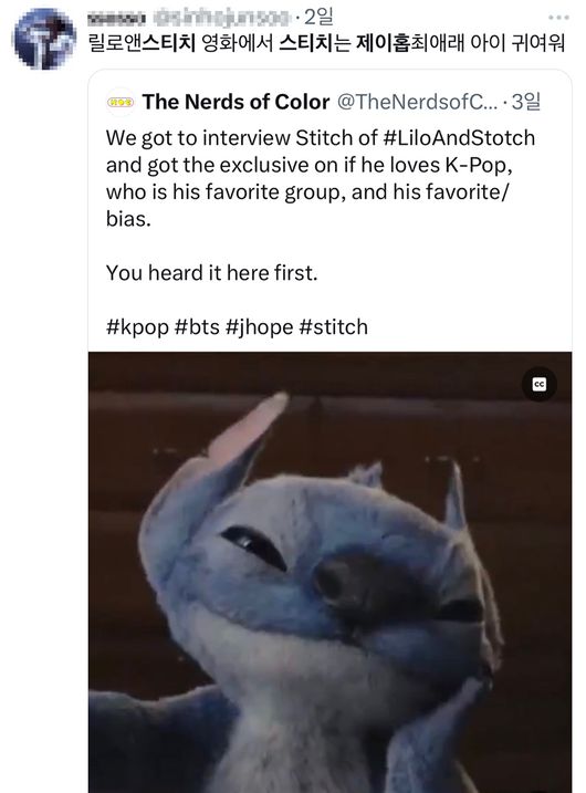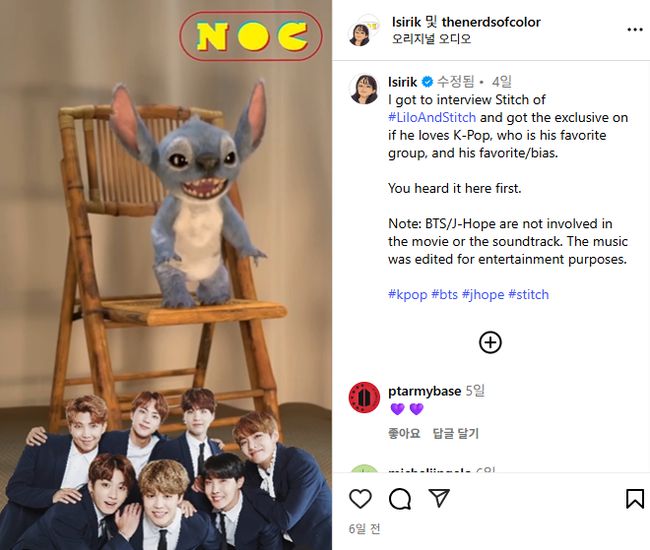 개봉 첫 주 CGV골든에그지수 97%와 함께 국내 전체 박스오피스 2위에 오르며 꾸준한 사랑을 받고 있는 영화 '릴로 & 스티치'에서 전 세계 팬들의 사랑을 받고 있는 캐릭터 ‘스티치’가 해외 매체인 ‘The Nerds of Color’와 인터뷰에서 방탄소년단에 대한 남다른 애정을 밝혔다.