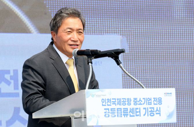 [공항사진기자단] 이학재 인천국제공항공사 사장이 27일 인천국제공항 제2공항물류단지 내 공동물류센터 현장에서 열린 '중소기업전용 공동물류센터 건설사업 기공식'에 참석해 축사를 하고 있다.