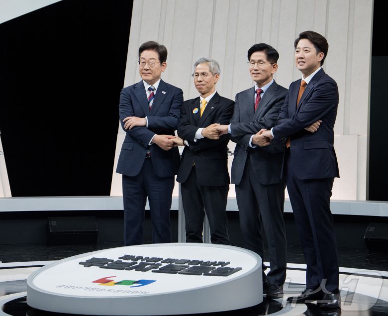 이재명 더불어민주당 대통령 후보(왼쪽부터), 권영국 민주노동당 대통령 후보, 김문수 국민의힘 대통령 후보, 이준석 개혁신당 대통령 후보가 27일 서울 마포구 상암동 MBC 스튜디오에서 진행된 정치 분야 TV토론회에 참석해 포즈를 취하고 있다. 2025.5.27/뉴스1 ⓒ News1 국회사진기자단 |