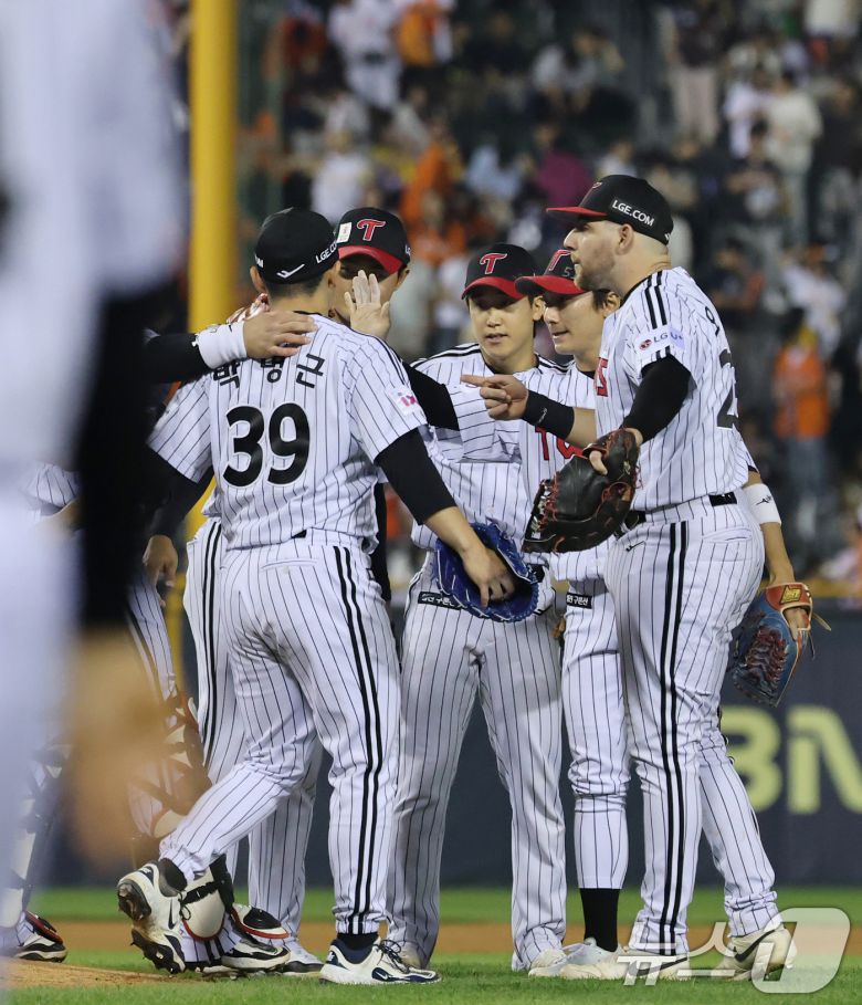 (서울=뉴스1) 오대일 기자 = 27일 오후 서울 송파구 잠실야구장에서 열린 프로야구 '2025 신한 SOL 뱅크 KBO리그' 한화 이글스와 LG 트윈스의 경기에서 2-1 신승을 거둔 LG 선수들이 그라운드에 모여 기쁨을 나누고 있다. 2025.5.27/뉴스1