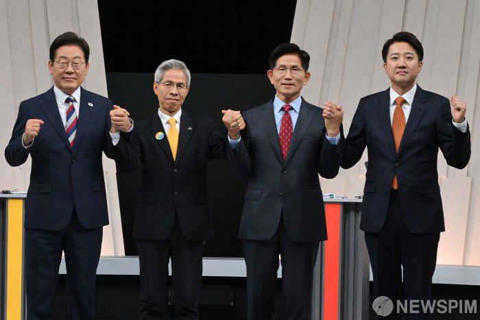 [서울=뉴스핌] 국회사진기자단 = 이재명 더불어민주당(왼쪽부터), 권영국 민주노동당, 김문수 국민의힘, 이준석 개혁신당 대선 후보가 27일 오후 서울 마포구 MBC 스튜디오에서 진행된 정치 분야 TV토론회에 앞서 포즈를 취하고 있다. 2025.05.27 photo@newspim.com |