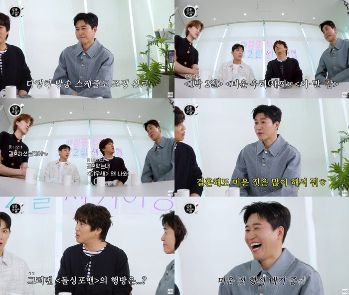 차태현은 “나는 관계도 없지만 속으로 걱정한 게 김준호도 오는 7월에 결혼하니까 ‘미운 우리 새끼’랑 ‘돌싱포맨’ 못 나오는 거 아닌가 싶었다. 얼마 전에 이상민도 결혼한다길래 ‘미운 우리 새끼’랑 ‘돌싱포맨’ 못 나오는 거 아닌가 싶었다. 그러면 ‘돌싱포맨’은 없어지는 거냐”고 궁금해했다. 김종민은 “나는 모르겠다”고 말했다.
