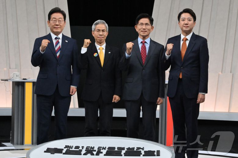 이재명 더불어민주당 대통령 후보(왼쪽부터), 권영국 민주노동당 대통령 후보, 김문수 국민의힘 대통령 후보, 이준석 개혁신당 대통령 후보가 27일 서울 마포구 상암동 MBC 스튜디오에서 진행된 정치 분야 TV토론회에 앞서 포즈를 취하고 있다. 2025.5.27/뉴스1 ⓒ News1 국회사진기자단
