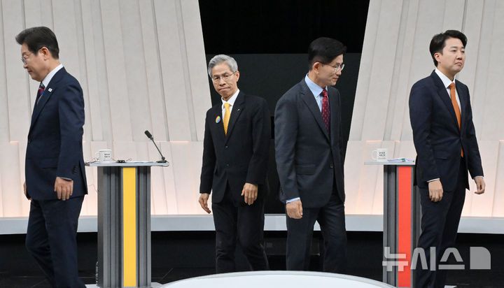 [서울=뉴시스] 국회사진기자단 = 27일 오후 서울 마포구 상암동 MBC 스튜디오에서 열린 중앙선거방송토론위원회 주관 제21대 대통령선거 3차 후보자토론회 시작에 앞서 각 정당 대선후보들이 기념촬영을 마친 뒤 자리로 돌아가고 있다. 왼쪽부터 이재명 더불어민주당, 권영국 민주노동당, 김문수 국민의힘, 이준석 개혁신당 대선후보. 2025.05.27. photo@newsis.com |