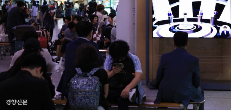 마지막 TV토론 보는 시민들 27일 서울역을 찾은 시민들 너머 화면에서 21대 대통령 선거 이재명 더불어민주당 후보·김문수 국민의힘 후보·이준석 개혁신당 후보·권영국 민주노동당 후보가 하는 마지막 TV토론이 생중계되고 있다. 이준헌 기자 heon@kyunghyang.com