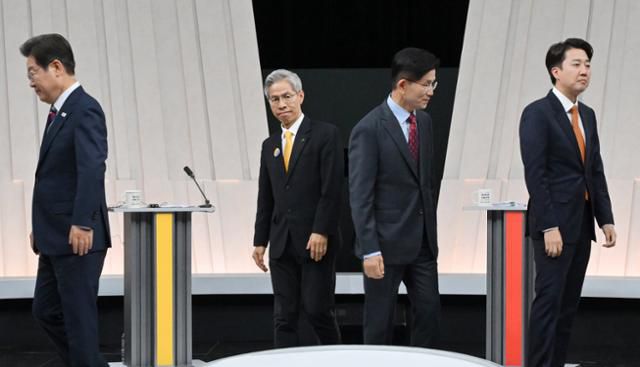 27일 오후 서울 마포구 상암동 MBC 스튜디오에서 열린 중앙선거방송토론위원회 주관 제21대 대통령선거 3차 후보자 토론회 시작에 앞서 각 정당 대선 후보들이 기념촬영을 마친 뒤 자리로 돌아가고 있다. 왼쪽부터 이재명 더불어민주당, 권영국 민주노동당, 김문수 국민의힘, 이준석 개혁신당 대선 후보. 뉴시스