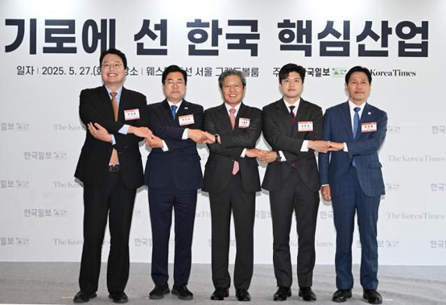 2025한국포럼 ‘기로에 선 한국 핵심산업’이 열린 27일 서울 중구 웨스틴 조선에서 천하람(왼쪽부터) 개혁신당 당대표 권한대행 겸 원내대표, 박찬대 더불어민주당 당대표 권한대행 겸 원내대표, 승명호 한국일보 회장, 김용태 국민의힘 비상대책위원장, 이학영 국회부의장이 참석해 기념촬영을 하고 있다. 왕태석 선임기자 |