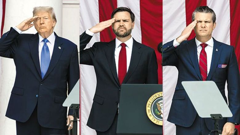 세 사람의 경례 방식은 ‘매뉴얼’과는 거리가 있다. 미 국방부 교범에 따르면, 오른손을 곧게 펴 다섯 손가락을 모두 붙인 뒤 검지손가락을 오른 눈썹 끝부분(모자 착용 시 챙 오른쪽 끝)에 두고, 손날 끝을 약간만 아래로 기울이는 게 제대로 된 거수경례다. 트럼프는 손날 각도는 교범에 가까웠지만, 엄지손가락을 나머지 손가락과 붙이지 않았다. 밴스와 헤그세스는 손가락을 모두 붙였지만 지나치게 손날을 기울여 손등을 필요 이상으로 드러냈다.