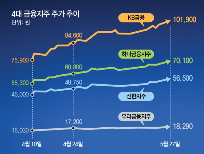 국내 금융지주 주가가 연일 최고가를 갈아치우며 가파른 상승세를 보이고 있다. 금융지주들의 실적이 호조를 보이고 있는 데다, 최근 국내 증시로 돌아온 외국인 투자자들이 금융주를 대거 사들인 영향으로 풀이된다. 여기에 주요 대선 후보들이 주가부양 정책을 공약으로 내세우면서 ‘밸류업’ 정책이 지속될 것이라는 기대감도 금융주 강세에 기여하고 있다. 코스피 시총 6위인 KB금융은 5위인 한화에어로스페이스를 바짝 뒤쫓고 있다.