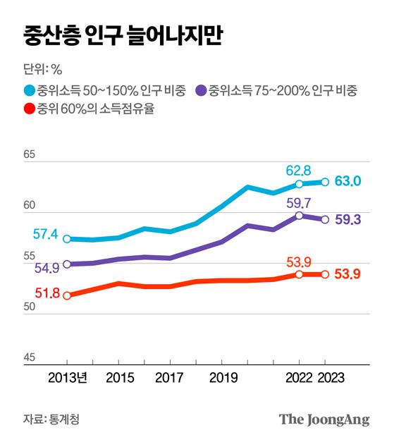 전체 소득 분포에서 중산층의 위치를 가늠할 수 있는 ‘중위 60%의 소득점유율(처분가능소득 기준)’ 또한 2013년 51.8%에서 2023년 53.9%로 증가했다. 각종 통계상으로는 중산층 인구와 경제력이 10년 전보다 커졌다는 의미다. 한국의 중산층 인구 비중이나 소득점유율은 OECD 회원국 평균과 비슷하거나 조금 더 양호한 수준이다.