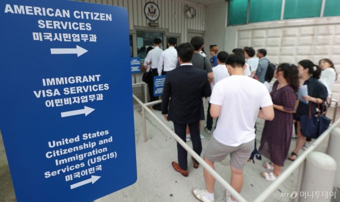 서울 종로구 주한 미국대사관 앞에 비자를 받으려는 시민들이 줄지어 서 있다. /사진=김창현 기자 |