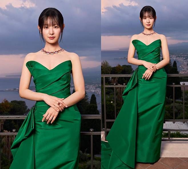 이탈리아 타오르미나의 해 질 녘, 에메랄드 드레스 위에 얹힌 핑크빛 하이 주얼리. 배우 김지원이 다시 한번 ‘클래식한 고혹’의 정석을 보여줬다.