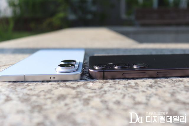 무게도 확실히 가볍다. 엣지는 163g으로, 196g인 S24플러스보다 33g이나 무게가 줄었다. 다만, '카툭튀(카메라가 툭 튀어나옴)'은 피해가지 못했다. 앙상하게 몸체 다이어트를 한 탓에 우뚝 솟아버린 카메라가 옥의 티였다.