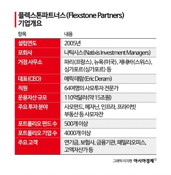 글로벌 사모자산 운용사인 플렉스톤파트너스는 2005년 스위스 제네바에서 설립됐다. 현재 파리, 뉴욕, 제네바, 싱가포르 등 4개 거점에서 64명의 투자 전문가가 근무하고 있다. 사모펀드, 메자닌, 인프라, 프라이빗 부동산 등 사모자산 전반에 투자한다.