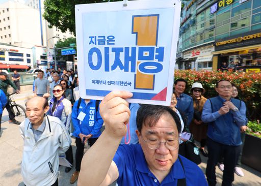 27일 서울 종로구 동묘앞역 인근에서 한 시민이 더불어민주당 이재명 대선 후보의 피켓을 들고 박찬대 상임총괄선거대책위원장의 지지 유세를 보고 있다. 연합뉴스 |