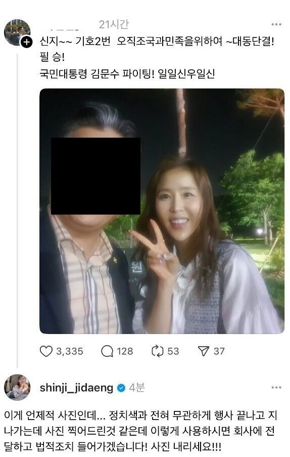 이어 "정치색과 전혀 무관하게 행사 끝나고 지나가는데 사진 찍어드린 것 같은데 이렇게 사용하시면 회사에 전달하고 법적조치 들어가겠습니다! 사진 내리세요"라고 강조했다.
