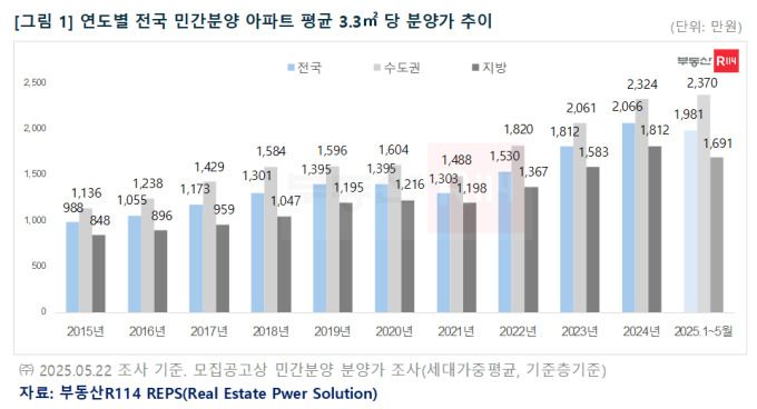 28일 부동산R114가 발표한 보고서에 따르면, 지난 10년(2015~2024년)간 전국 민간분양 아파트의 3.3㎡당 평균 분양가는 2015년 988만원에서 2024년 2066만원으로 2.1배 상승했다. 지역별로는 제주가 3.1배로 가장 많이 올랐으며, 대전(2.5배), 서울(2.4배), 광주(2.4배), 울산(2.2배) 등이 그 뒤를 이었다.