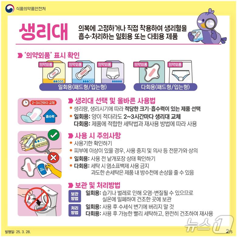 (서울=뉴스1) 조유리 기자 = 식품의약품안전처는 28일 '세계 월경의 날'을 맞이해 의약외품 생리용품의 올바른 사용법과 주의사항 등 안전 사용 정보를 안내했다.