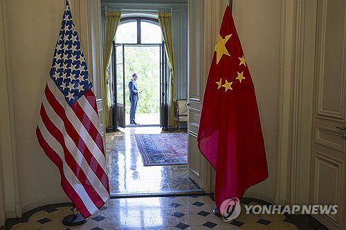스위스 제네바 미중 회담장에 걸려 있는 미국 성조기와 중국 오성홍기 |