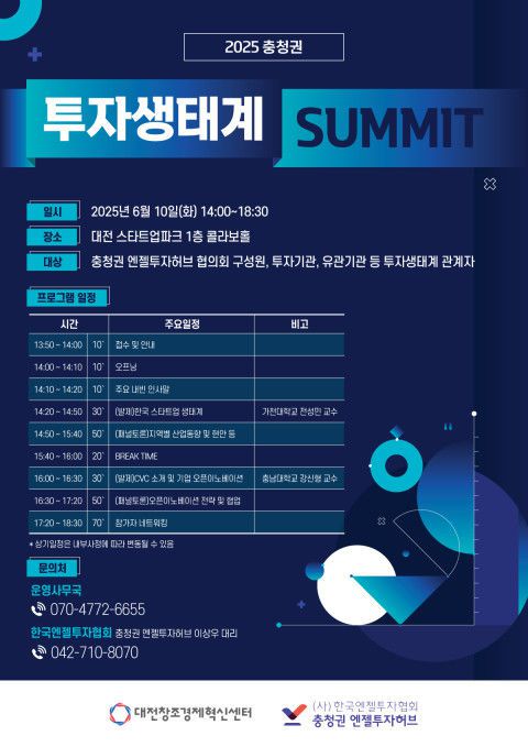 이번 서밋은 지역 산업 동향과 투자생태계의 접점을 모색하고 충청권 내 투자 활성화와 오픈이노베이션 협업 전략을 공유하기 위해 투자기관, 기업, 유관기관 등 충청권 핵심 관계자들이 한자리에 모인다. 행사는 한국엔젤투자협회 충청권 엔젤투자허브와 대전창조경제혁신센터가 공동 주관한다.
