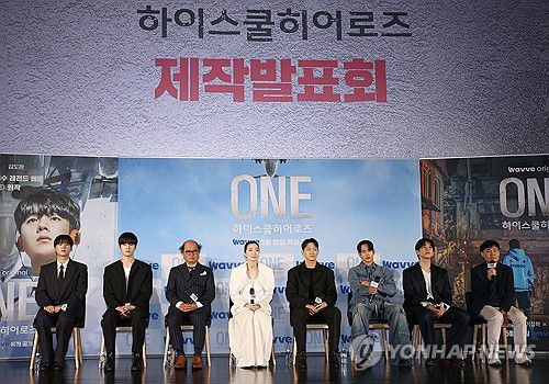 (서울=연합뉴스) 이재희 기자 = 28일 서울 광진구 롯데시네마 건대입구점에서 열린 웨이브 드라마 '원: 하이스쿨히어로즈' 제작발표회에 배우 이정하(왼쪽부터), 김도완, 김상호, 김주령, 유희제, 육준서, 임성균, 이성태 감독이 참석하고 있다. 2025.5.28