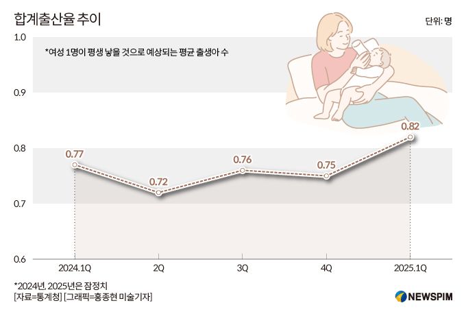 통계청이 28일 발표한 '2025년 3월 및 1분기 인구동향'에 따르면 1분기(1~3월) 합계출산율은 0.82명으로 집계됐다. 이는 지난 2022년 1분기(0.87명) 이후 최대치다.