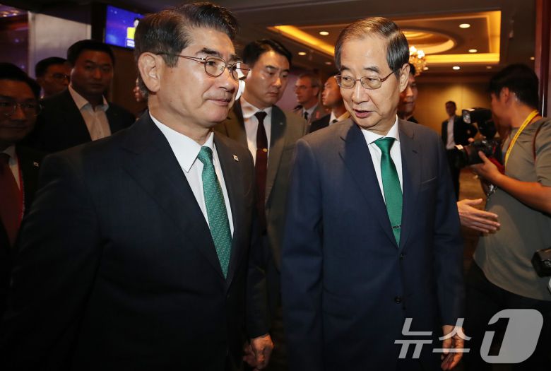 한덕수 전 국무총리(오른쪽)와 김용현 전 국방부 장관이 지난해 9월 11일 오전 서울 중구 소공동 롯데호텔에서 열린 2024 서울안보대화에서 이야기를 나누고 있다. 2024.9.11/뉴스1 ⓒ News1 임세영 기자 |