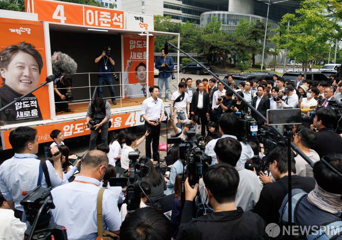 [서울=뉴스핌] 윤창빈 기자 = 이준석 개혁신당 대통령 후보가 28일 오후 서울 여의도공원에서 열린 유세를 마치고 언론 백브리핑을 하고 있다. 2025.05.28 pangbin@newspim.com