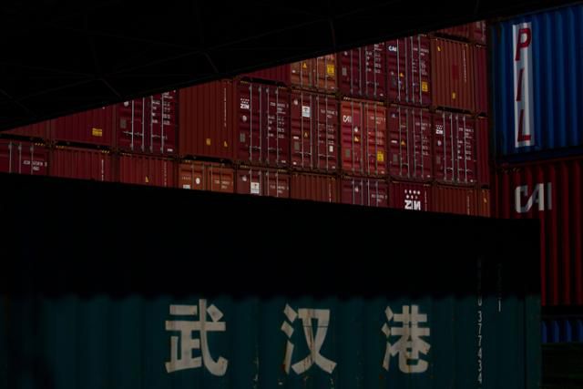 23일 중국 후베이성 우한의 양뤄항에 컨테이너들이 높게 쌓여 있다. 우한=AP 연합뉴스 |