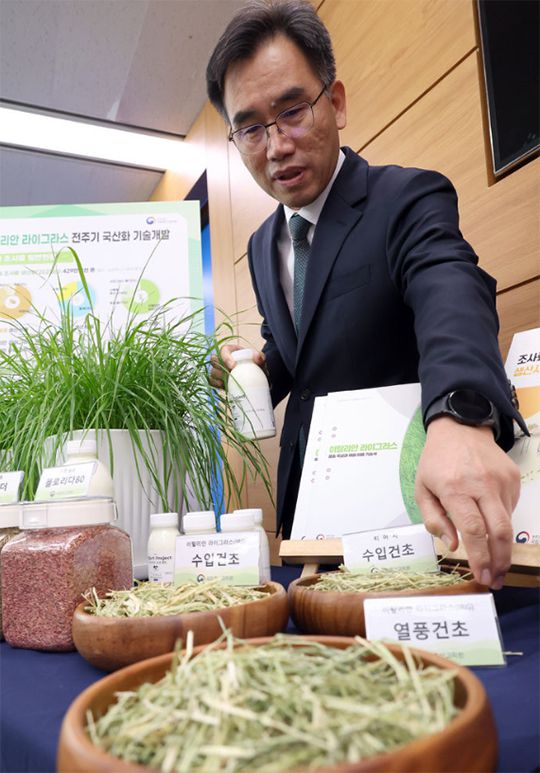 임기순 농촌진흥청 국립축산과학원장이 28일 세종시 정부세종청사에서 겨울철 사료작물인 이탈리안 라이그라스 품종 개발부터 종자생산, 건초가공, 유통 까지 '전주기 국산회 기술체계'를 구축, 국산 풀사료 산업의 자립 기반을 마련했다고 밝히고 있다./뉴시스 |