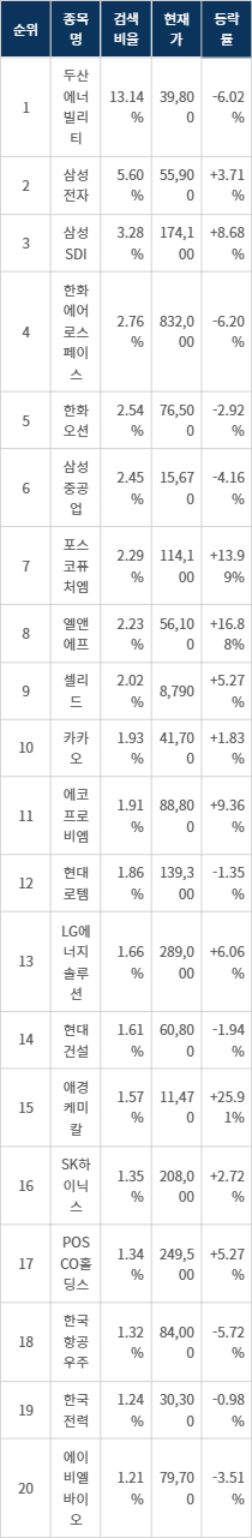 이어 검색비율 2위의 삼성전자(005930)는 상승률 3.71%로 상승 마감했다. 검색비율 3위의 삼성SDI(006400)는 8.68% 상승 마감했다. 검색비율 4위 한화에어로스페이스(012450)는 하락률 6.20%로 하락했다. 검색비율 5위 한화오션(042660)은 2.92% 하락하며 약보합으로 마감했다.