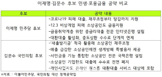 이 후보의 중금리 대출 전문 인뱅에 맞서 김 후보는 서민금융진흥원과 신용회복위원회, 지역신용보증재단 등에 분산한 서민금융 기능을 통합한 소상공인 전문 국책은행을 설립한다는 계획이다. 다만 김 후보는 은행권의 기금 마련이나 가산금리 조정 등에 대해선 공약집에 담지 않았다.