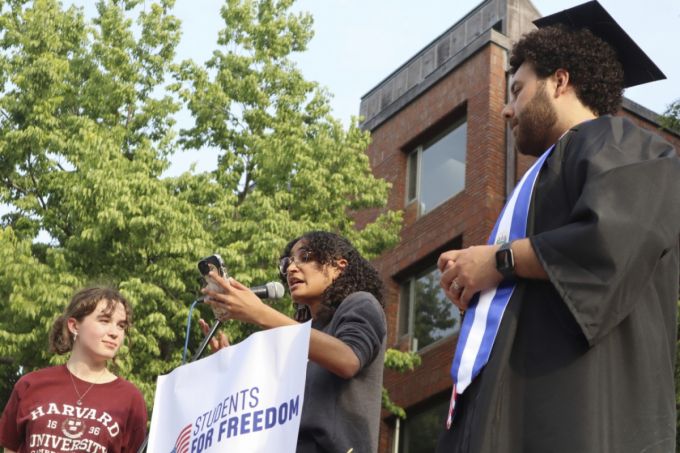 27일(현지 시간) 미 매사추세츠주 케임브리지의 하버드대학교 사이언스센터 광장에서 이 학교 학생들이 최근 도널드 트럼프 대통령의 하버드 제재에 반대하며 발언하고 있다. /AP=뉴시스 |
