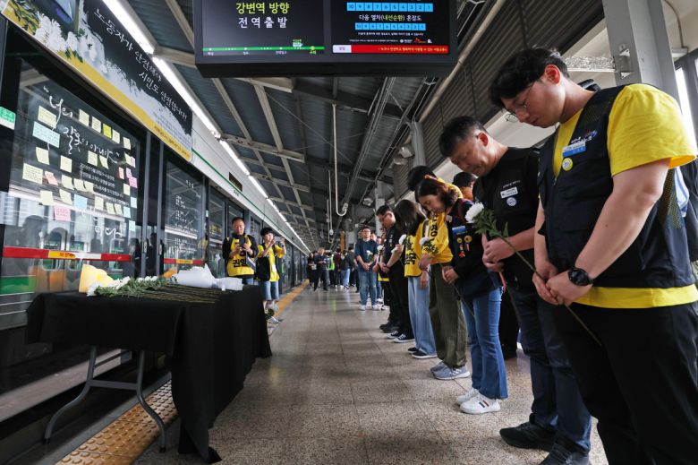 구의역 스크린도어 사망 사고 9주기인 28일 서울 광진구 구의역 플랫폼에서 공공운수노조 조합원 등이 묵념하고 있다. 정효진 기자 |
