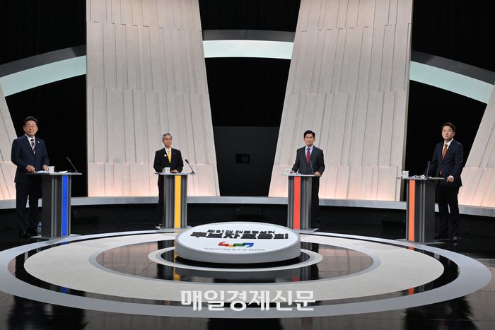 더불어민주당 이재명(왼쪽부터), 민주노동당 권영국, 국민의힘 김문수, 개혁신당 이준석 대선 후보가 27일 서울 마포구 상암동 MBC 스튜디오에서 진행된 정치 분야 TV토론회에 참석해 있다. |
