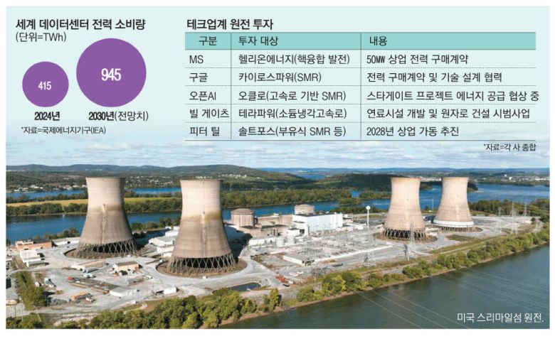 인공지능(AI) 주도권 경쟁이 치열해지면서 마이크로소프트(MS), 구글, 오픈AI 등 빅테크 기업들이 원자력 발전에 앞다퉈 투자하고 있다. AI의 핵심 인프라스트럭처인 데이터센터 건설이 늘어나면서 전력 수요 또한 급증하고 있기 때문이다.