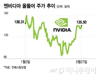 이후 엔비디아 주가는 지난 4월4일 94.31달러까지 떨어졌다가 27일엔 135.50달러로 43.7% 급등하며 올들어 낙폭 대부분을 만회했다. 엔비디아 주가는 올들어 0.9% 떨어진 상태다. 27일엔 전반적인 증시 강세 속에 주가가 3.2% 상승했다.