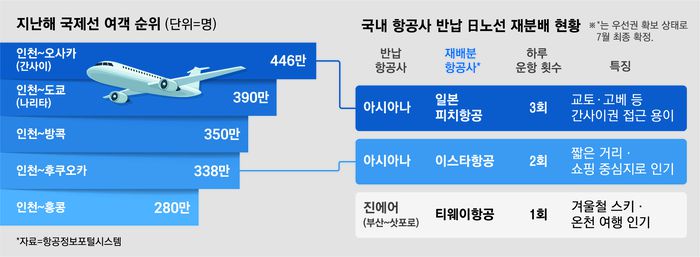 이번 재배정으로 아시아나의 타격은 불가피하다. 인천~오사카·후쿠오카 양 노선을 합친 이용객이 지난해 기준 108만명에 달하기 때문이다. 이전이 완료되면 아시아나항공은 양 노선을 각 하루 1편씩만 남겨놓게 된다. 대한항공은 현재 인천~오사카 일 4편, 인천~후코오카 일 3편을 각각 운항 중이다.