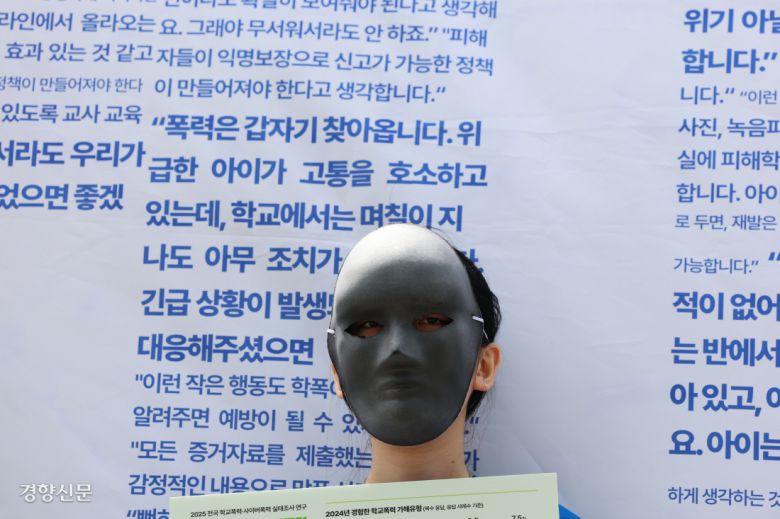 학교폭력 피해 경험이 있는 이가영씨(가명)는 이날 기자회견에서 “시간이 지날수록 교실 안에서 제 존재가 점점 작아졌고, 결국엔 저 자신을 숨기며 은둔하듯 지내기 시작했다”고 말했다. ‘봤지만 보지 못한’ 방관자의 수가 많아질수록 피해자의 존재는 옅어진다. 기자회견 마지막 순서로 활동가들은 방관의 탈을 벗어 던졌다. ‘갑자기 찾아오는 폭력’을 방관하지 않는 주변인들이 더 많이 필요하다는 의미에서다.