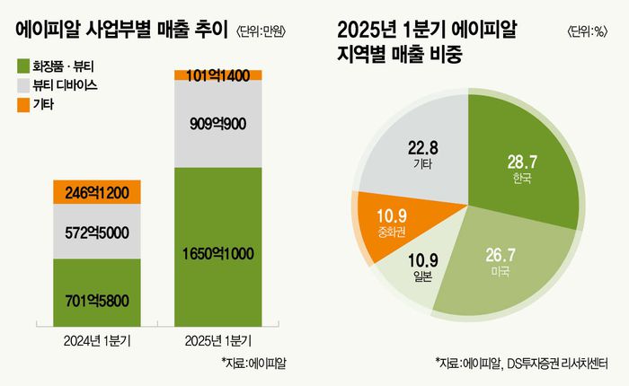 특히 2019년 본격적으로 진출한 미국 시장이 핵심이다. 지난 2022년 299억원이던 미국 매출은 2023년 679억원, 지난해 1583억원으로 2년 연속 100% 이상 성장률을 기록 중이다. 올해 1분기 역시 매출 709억원을 기록하며 전년 동기 대비 187% 성장했다. 이제는 해외에서 가장 많은 매출을 일으키는 지역으로 거듭났다. 올해 1분기 기준 에이피알 매출에서 미국 비중은 27%로, 국내(29%)에 이어 두 번째로 높다.
