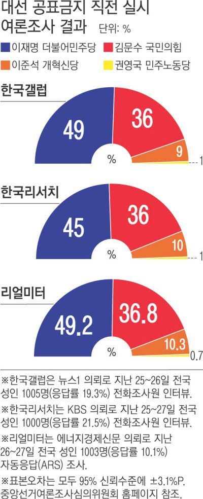 6·3 대통령 선거 여론조사 공표금지 직전에 진행된 복수의 여론조사에서 이재명 더불어민주당 후보가 김문수 국민의힘 후보를 오차범위 밖에서 앞선 것으로 나타났다.